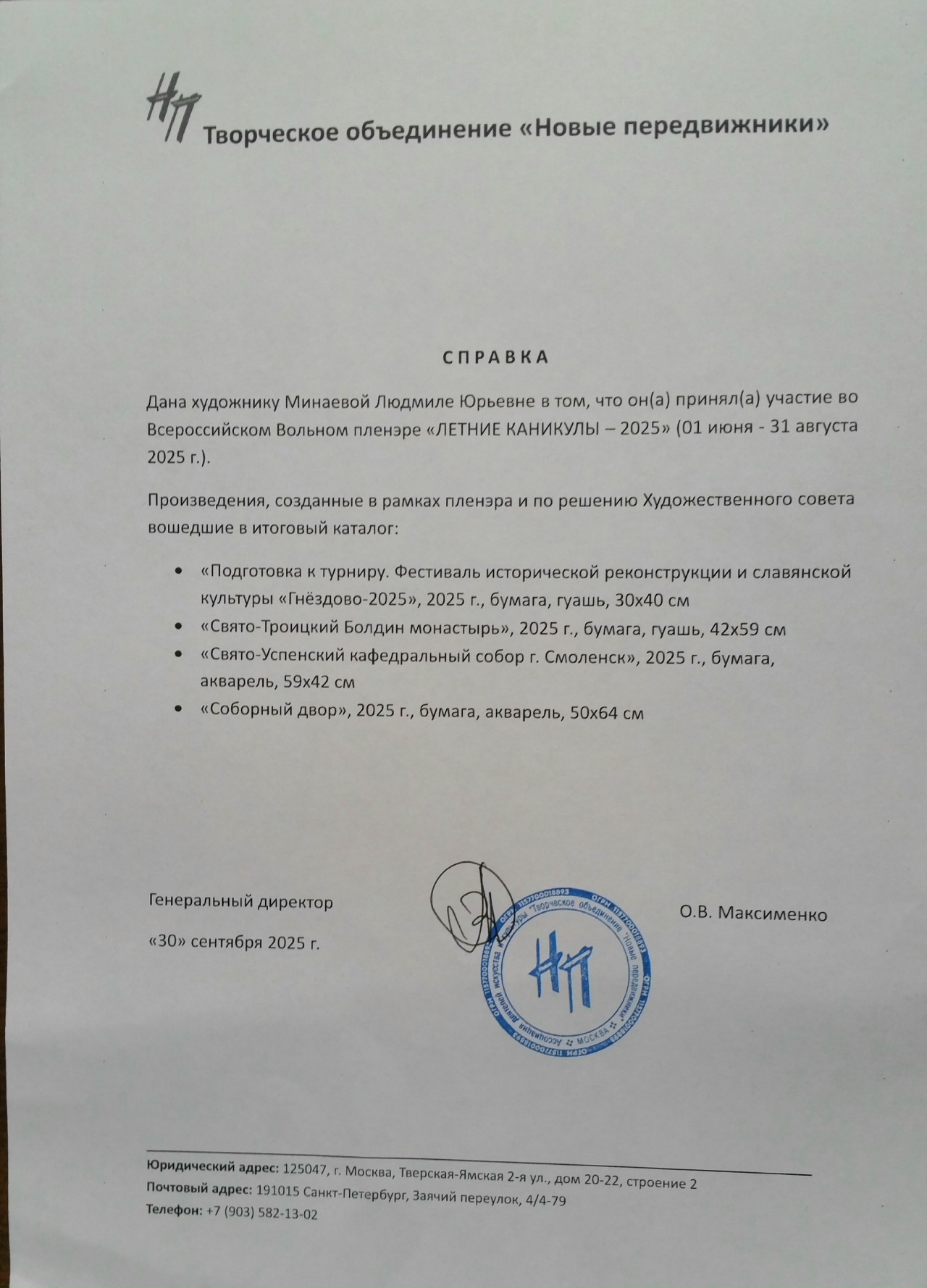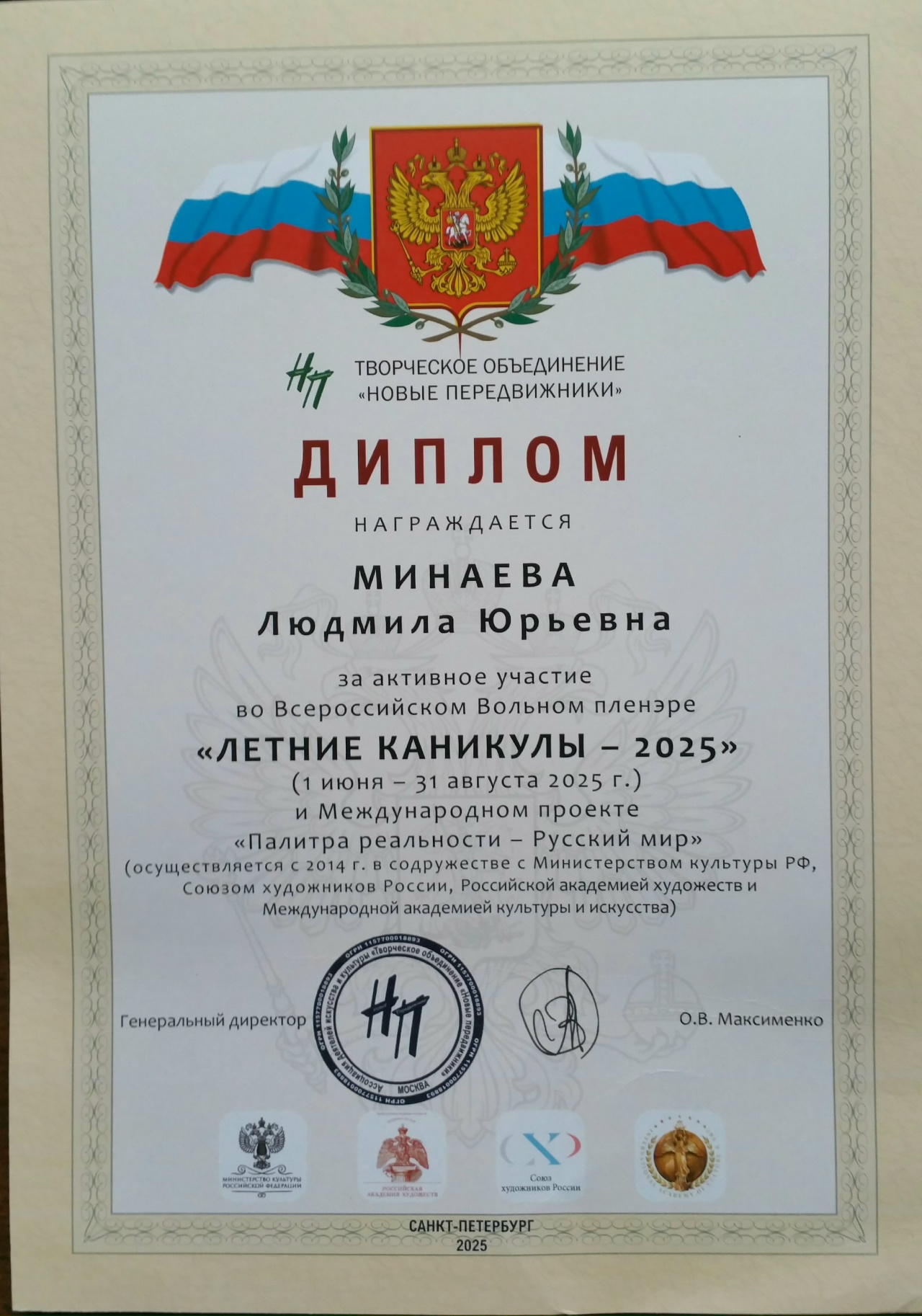 Преподаватель художественного отделения Минаева Людмила Юрьевна приняла участие во Всероссийском Вольном пленэре "Летние каникулы-2025", который проводился с 01 июня по 31 августа 2025 г.