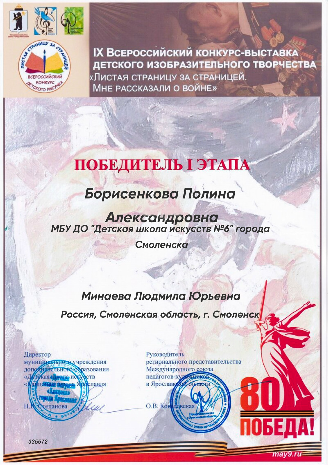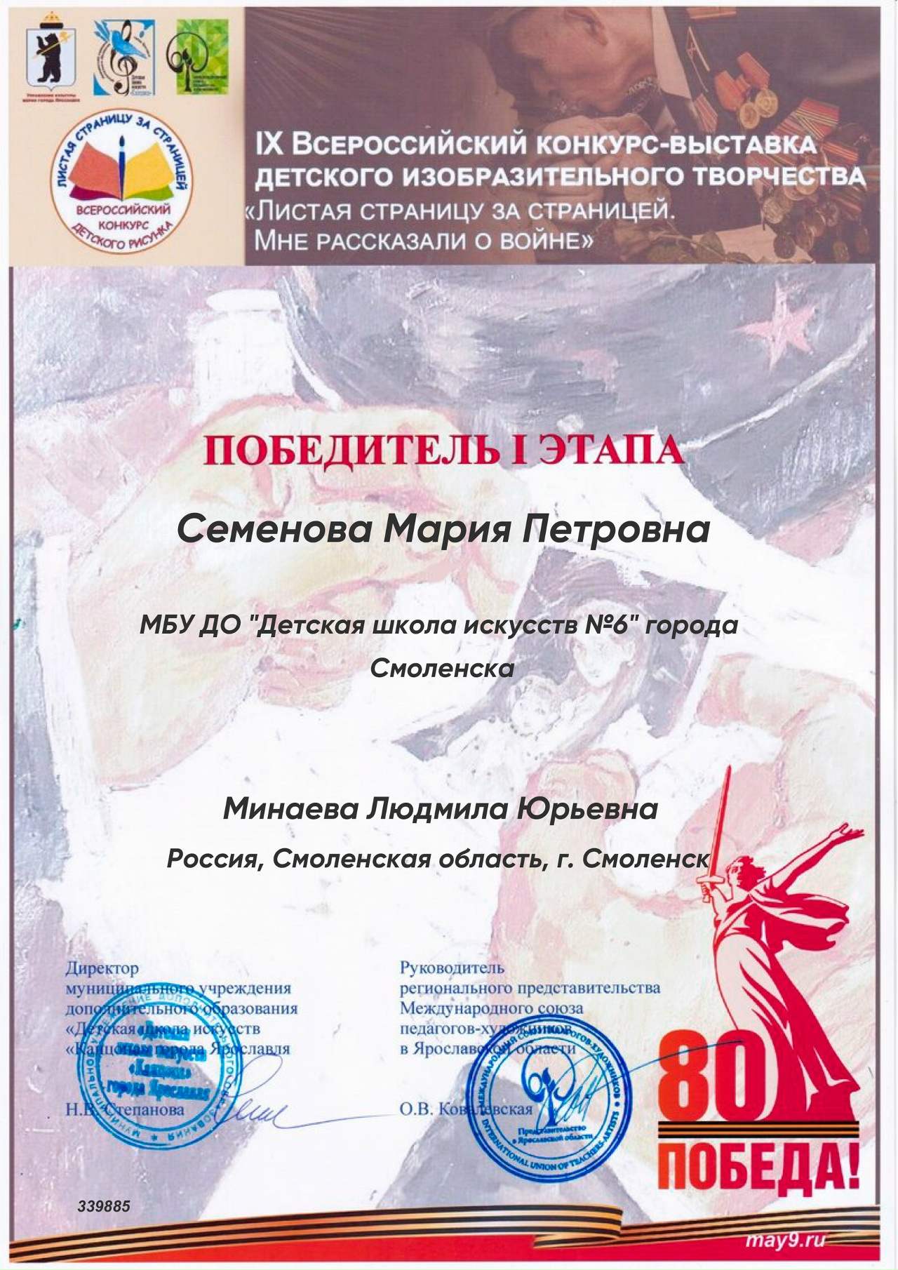 Победа в первом этапе IХ Всероссийского конкурса-выставки детского изобразительного творчества «Листая страницу за страницей. Мне рассказали о войне»